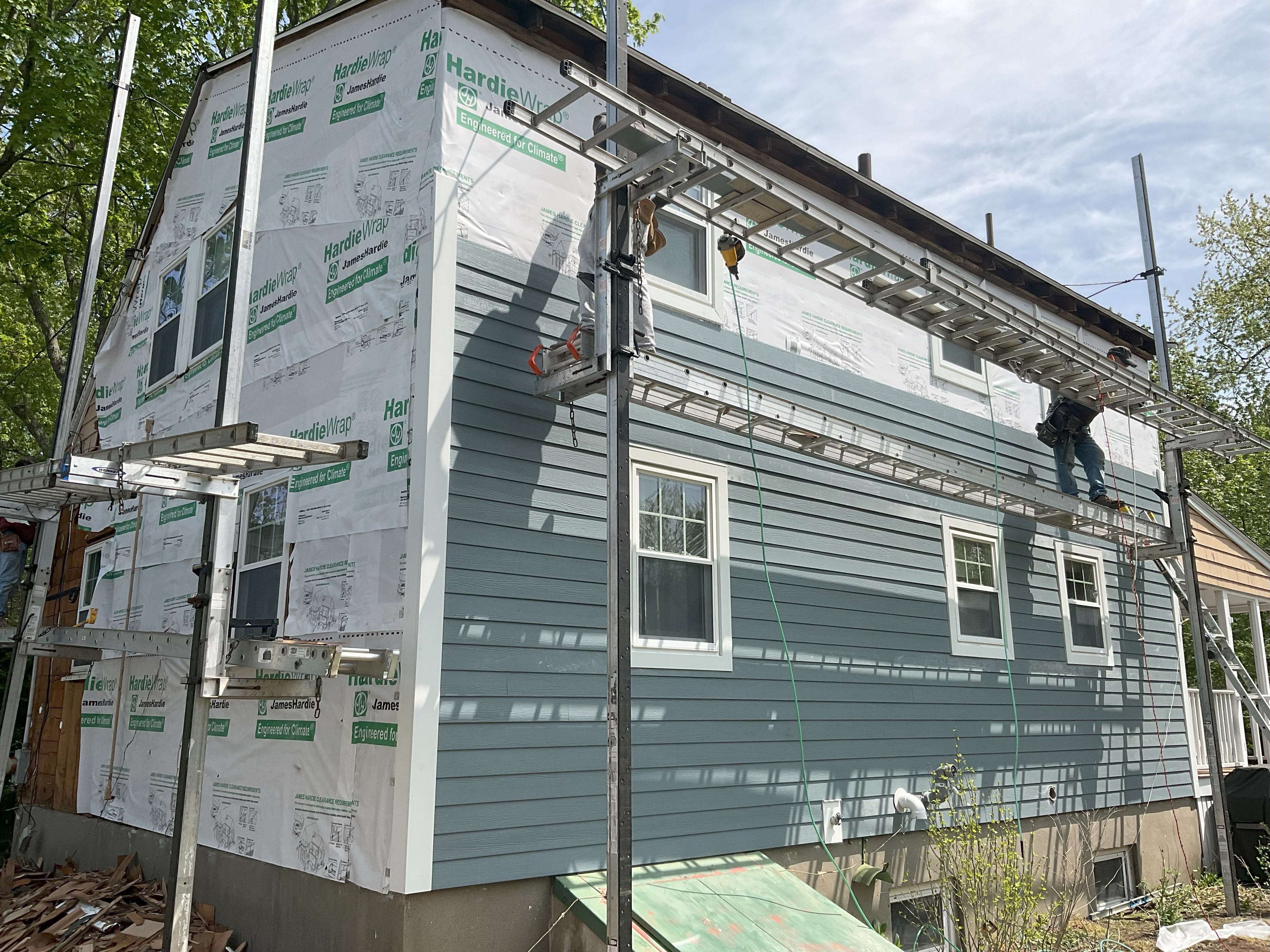 • James Hardie CedarMill clapboard siding in Boothbay Blue, James Hardie vented soffit in white, James Hardie trimboard in white, 5K seamless gutters in white, and 2x3 downspouts in white.