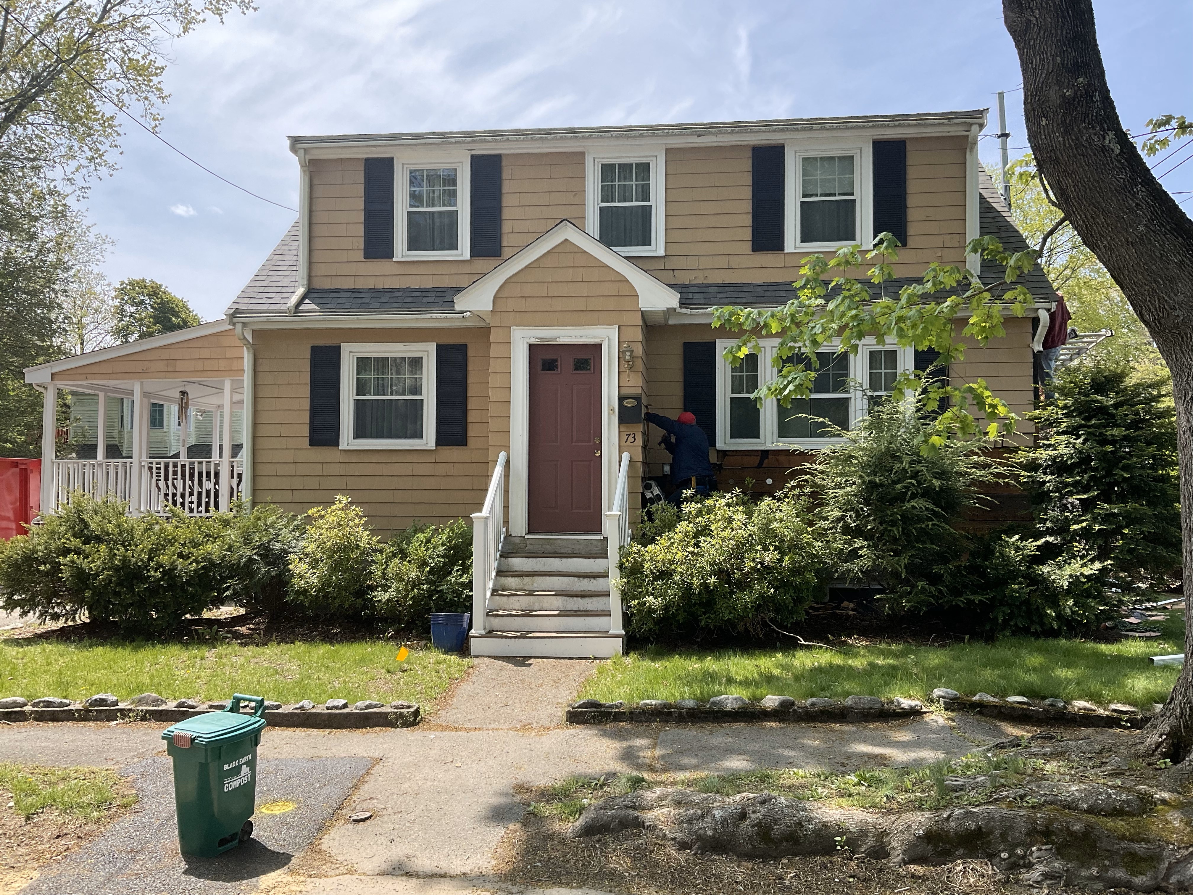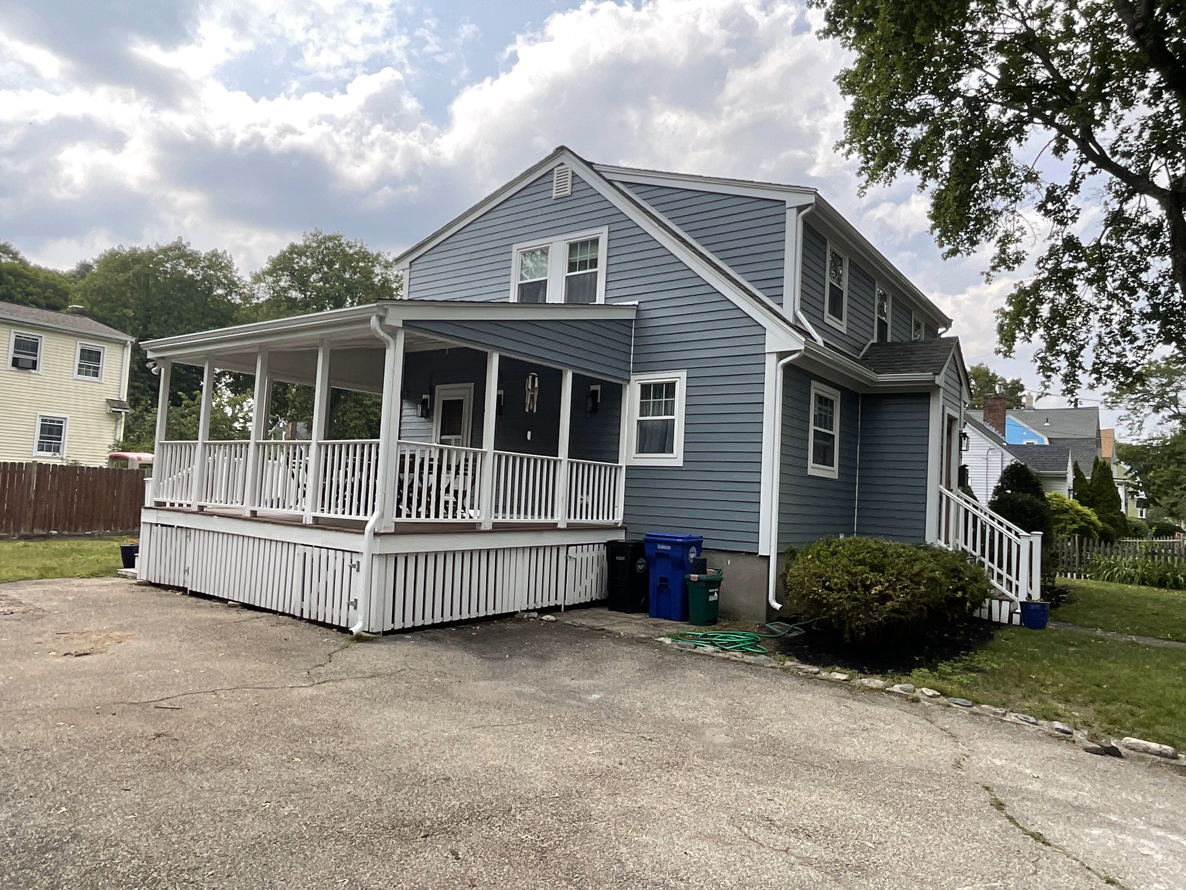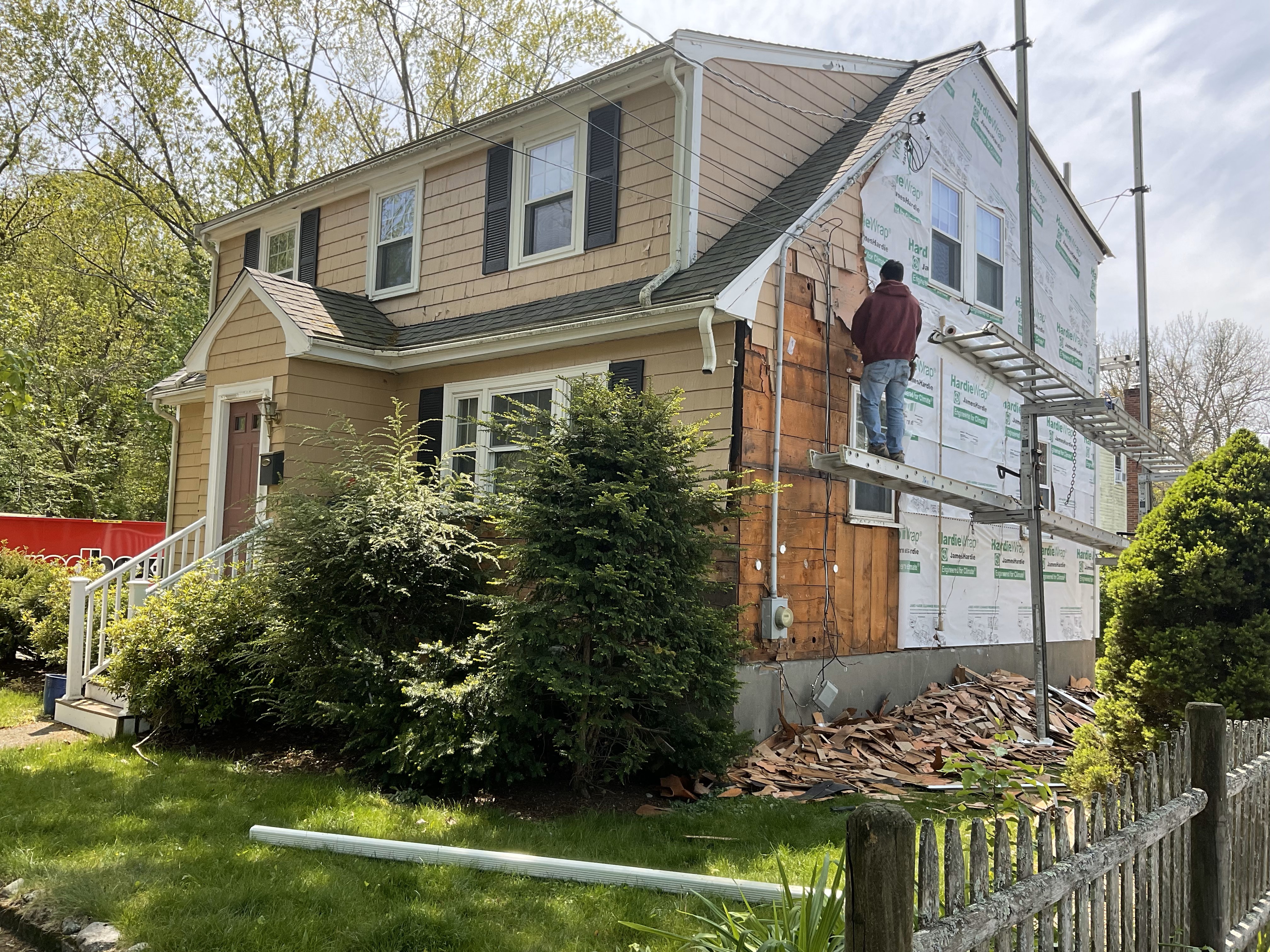 James Hardie siding and trim replacement. This customer wanted the look and feel of wood siding without the cost and upkeep that goes into wood siding. We stripped the existing siding, install new James Hardie CedarMill siding, new James Hardie trim, and seamless 5K gutters with 2x3 downspouts.