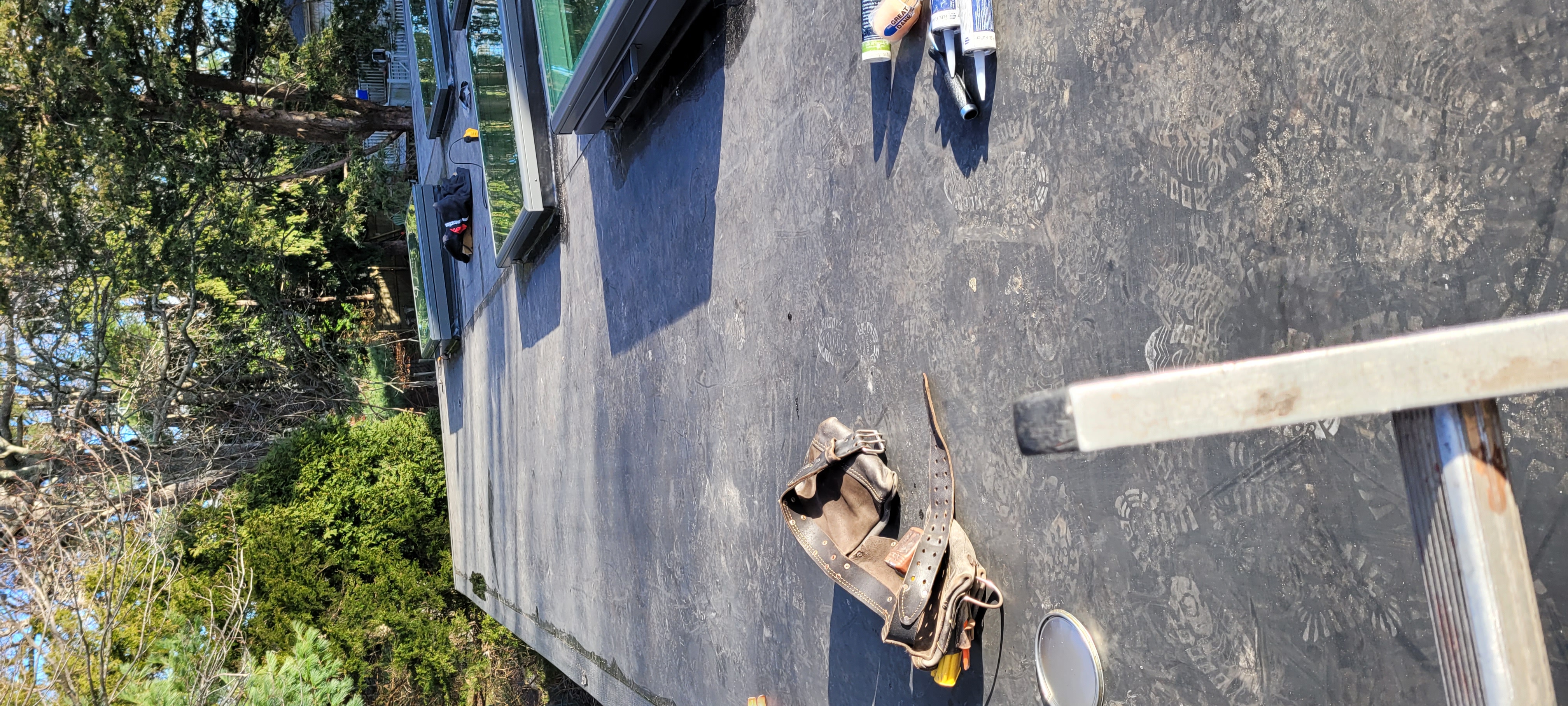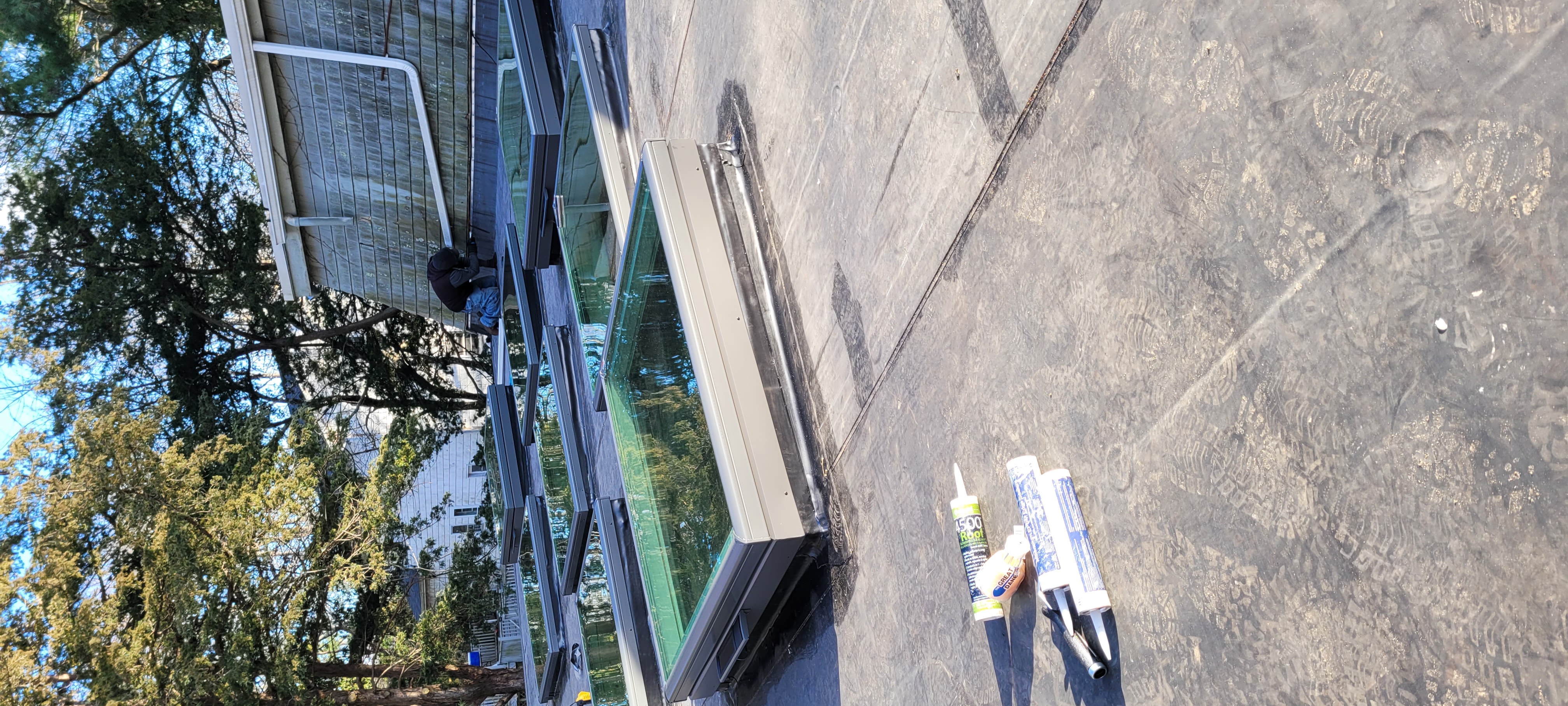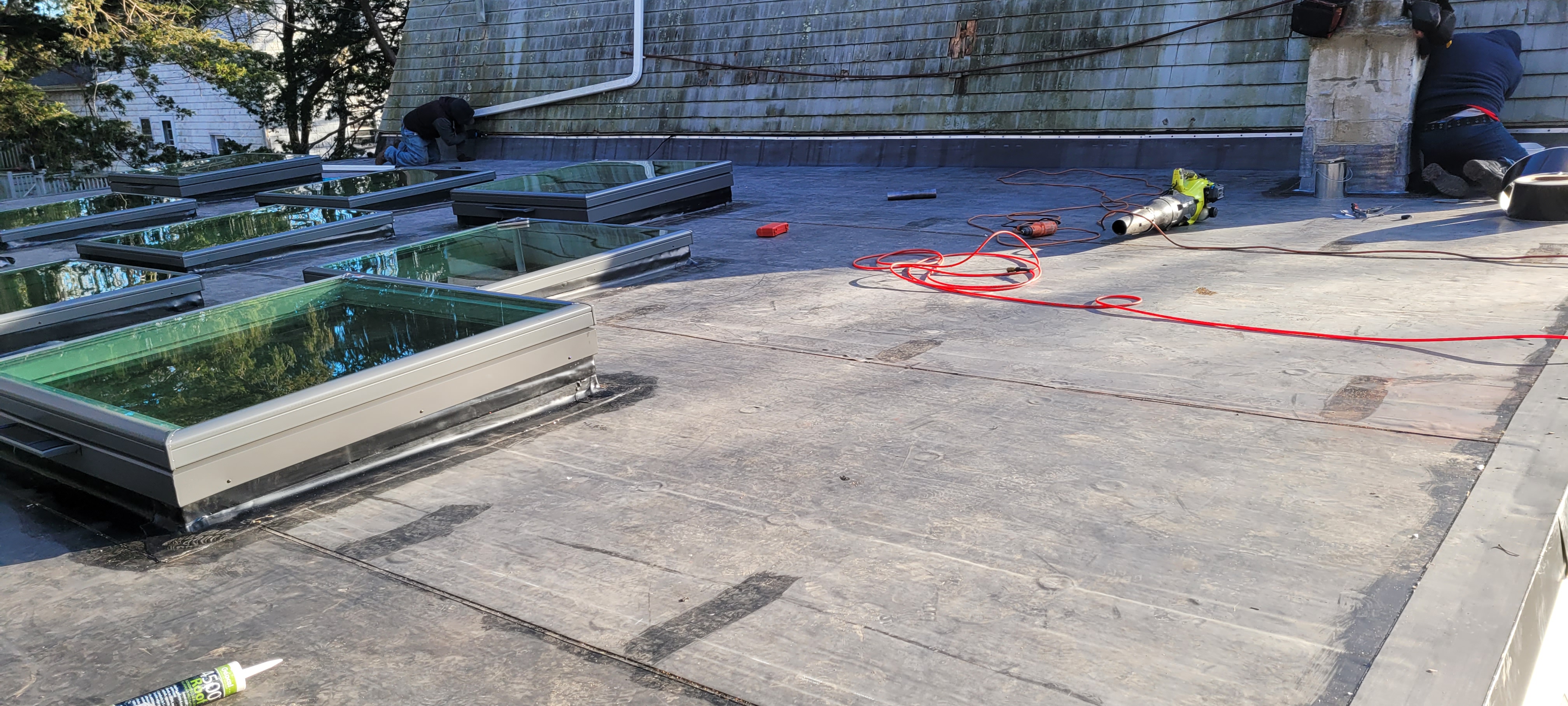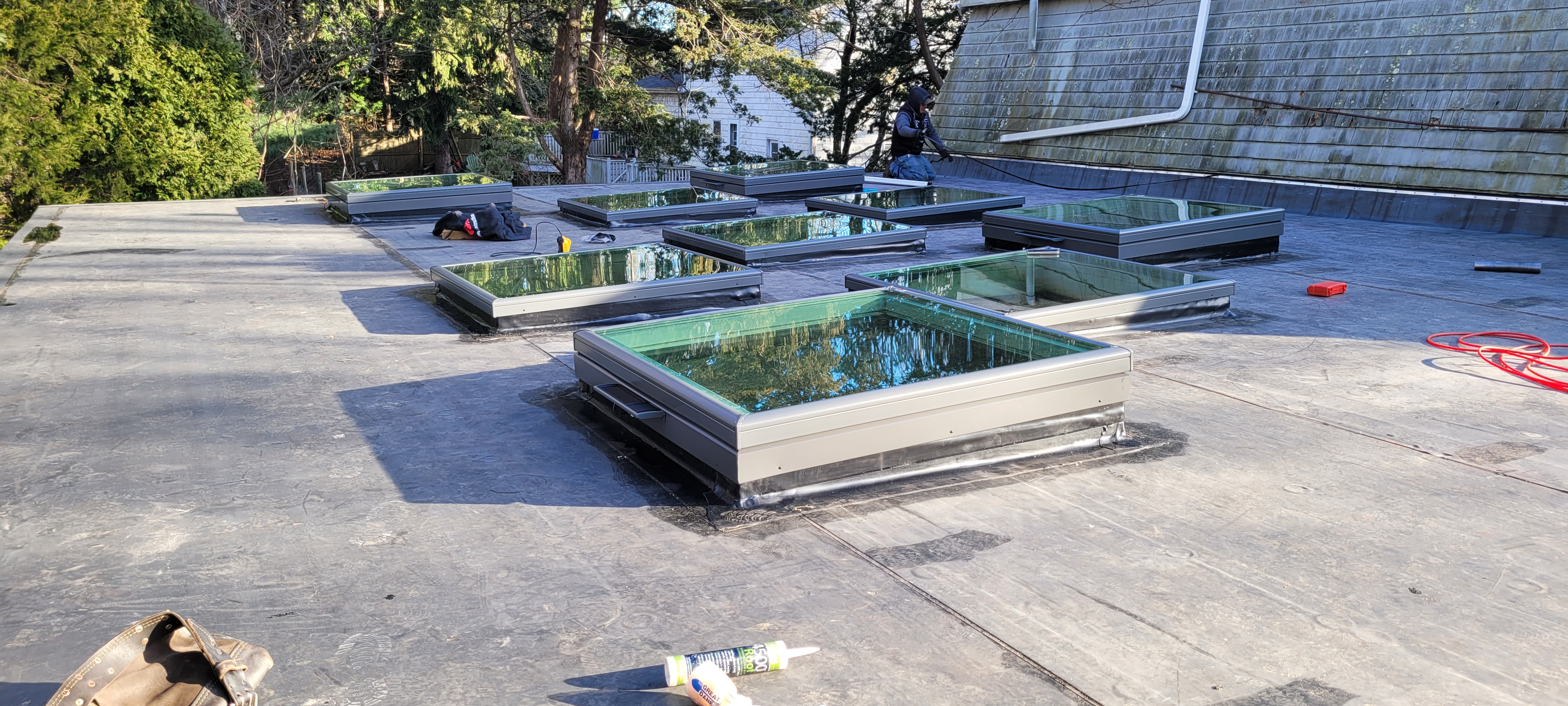 Flat roof replacement with 9 curb mounted skylights. The homeowner wanted to allow more light into the reading room on the back of the home. We cut out the openings and built curbs for the skylights. Curb mounted skylights are required for flat roofs. This is an added layer of protection against leaks. We used our Equipter to collect all of the debris. Not a single piece of old roofing touched the ground. We take the necessary steps the keep your home protected from the outside.