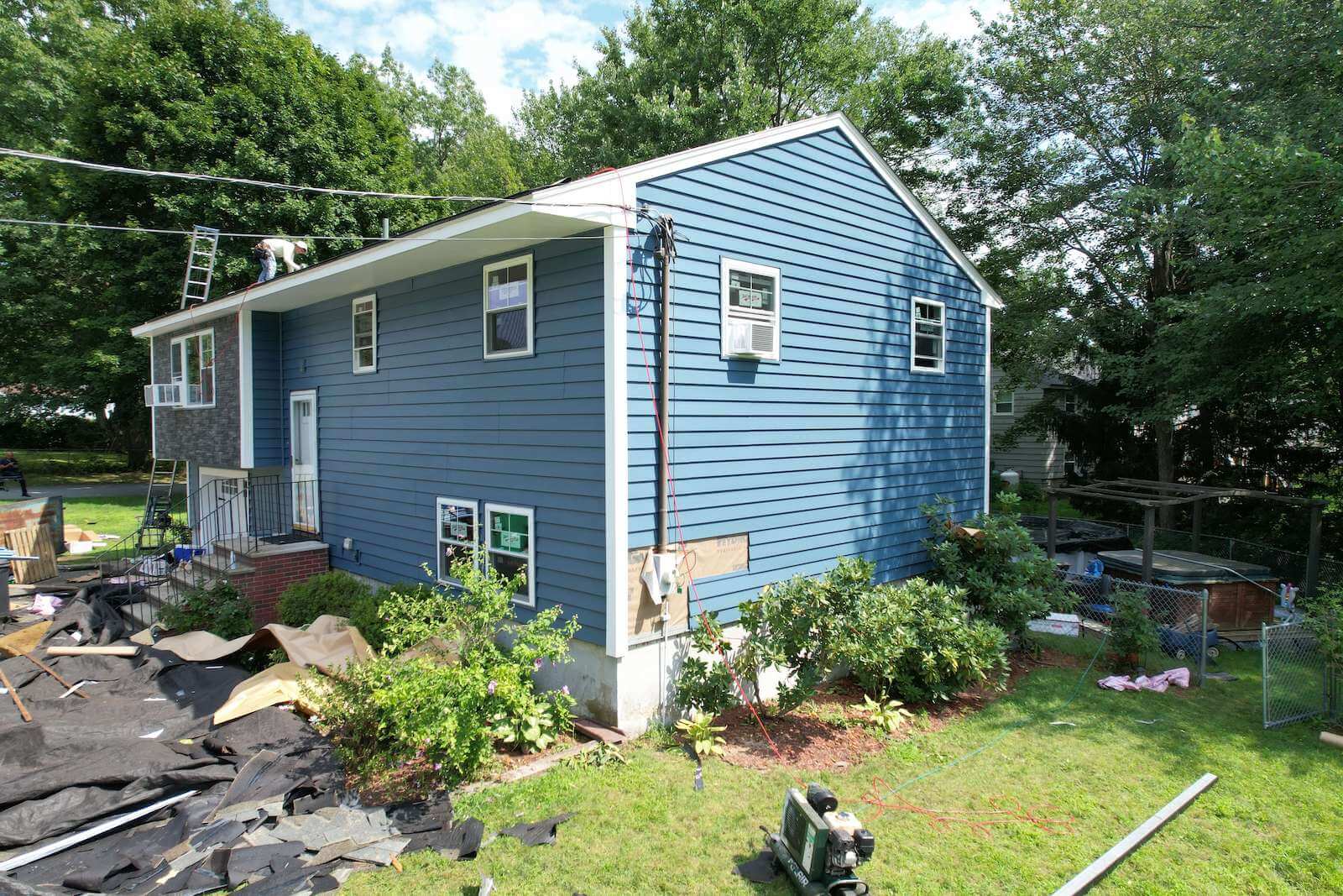 - Siding: Craneboard Triple 6 Regatta Blue vinyl siding, white vinyl corner posts, white PVC aluminum window, door, and fascia capping, Premium Point white hidden vent vinyl soffit, and Lewiston Crest Stacked Stone vinyl siding on the bump out above the garage door.