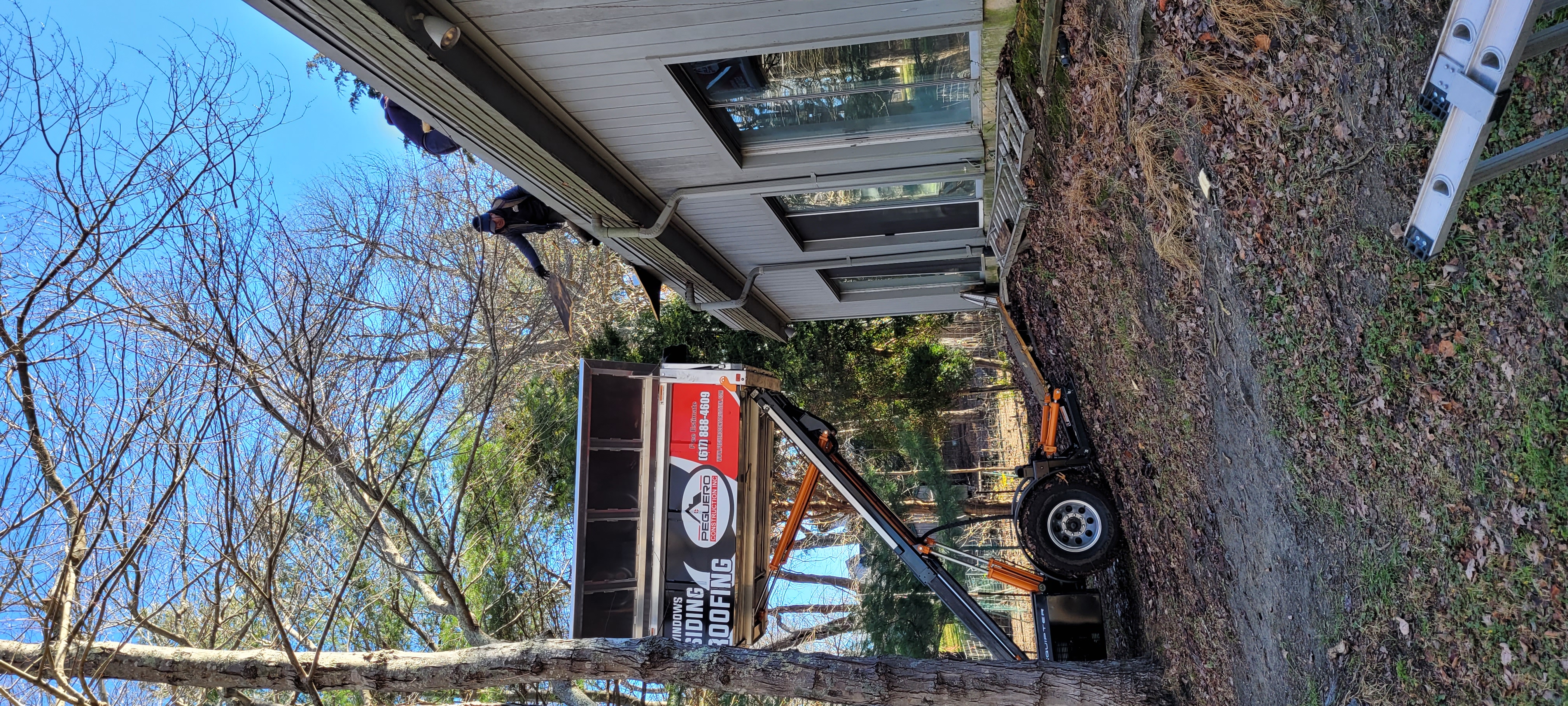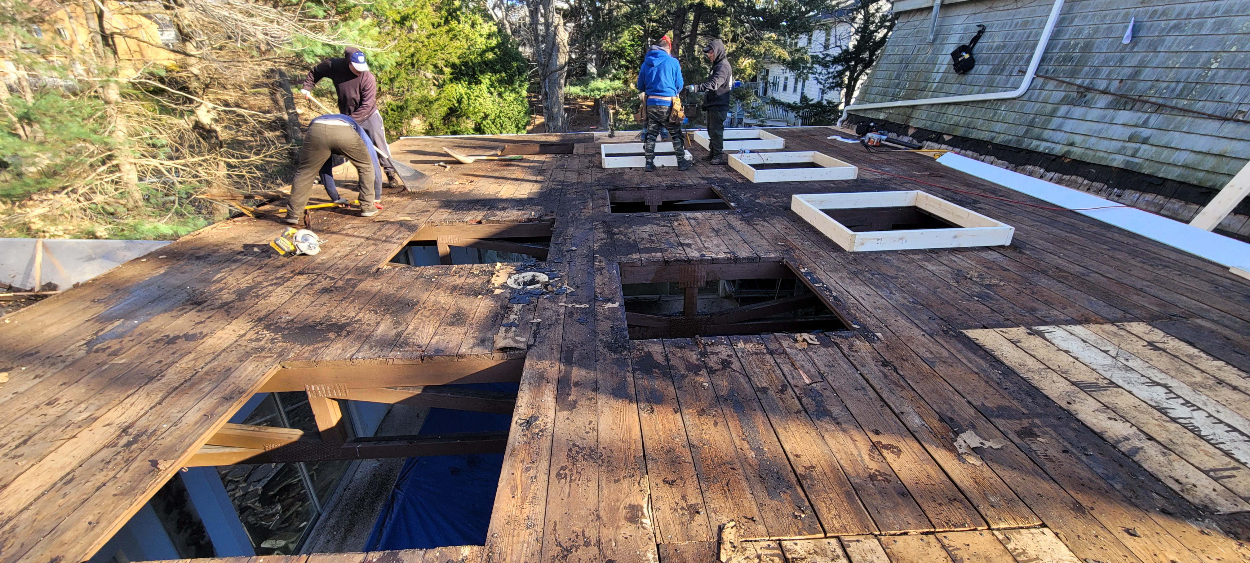 Flat roof replacement with 9 curb mounted skylights. The homeowner wanted to allow more light into the reading room on the back of the home. We cut out the openings and built curbs for the skylights. Curb mounted skylights are required for flat roofs. This is an added layer of protection against leaks. We used our Equipter to collect all of the debris. Not a single piece of old roofing touched the ground. We take the necessary steps the keep your home protected from the outside.